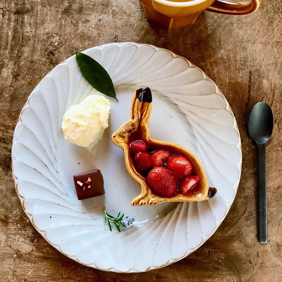 2020SS新商品 ラパンはフランス語でうさぎです。 今日は、キャラメル色の小さなお皿、ラパンを主役に食後のデザートを盛り付けました。 塩アイスと苺の砂糖煮。 甘いの...