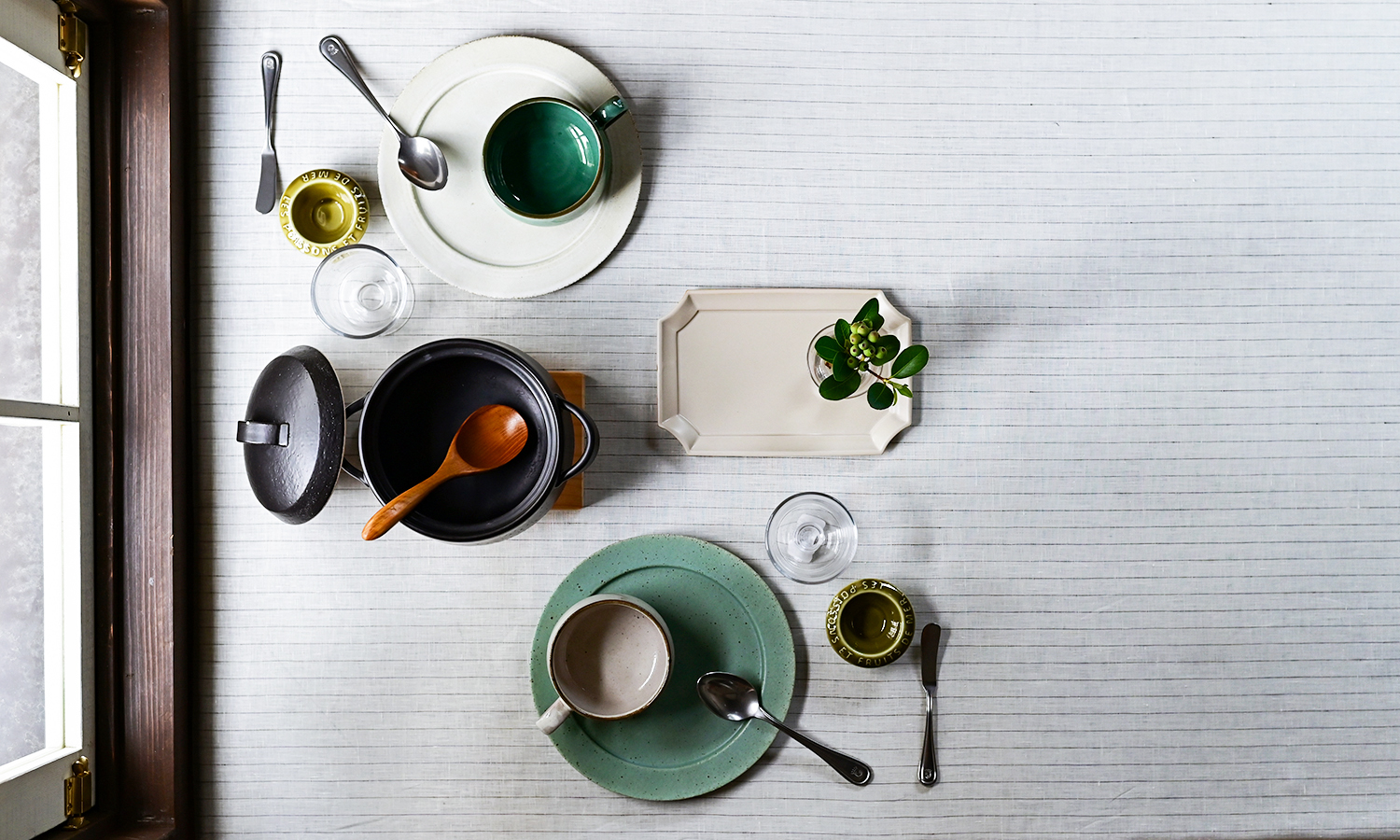 絹のようにしっとりとした生地感のクロスに、装飾的な器を合わせ、落ち着きの中に可愛らしさが漂うコーディネート。 ワントーンでまとめることで、上品な生地と繊細な絵柄や装飾が施された器が調和し、 それぞれの器の個性が一層引き立ちます。