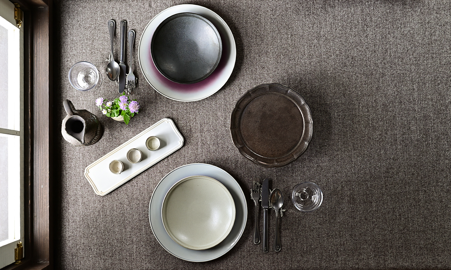 比較的薄手な磁器素材の器は、さらりとした軽やかな風合いのクロスによく似合います。単調になってしまわないようにと取り入れたのが、柄の器と紺や黒の器。柄はアクセントに、濃い色の器はテーブル全体を引き締めてくれる効果があります。