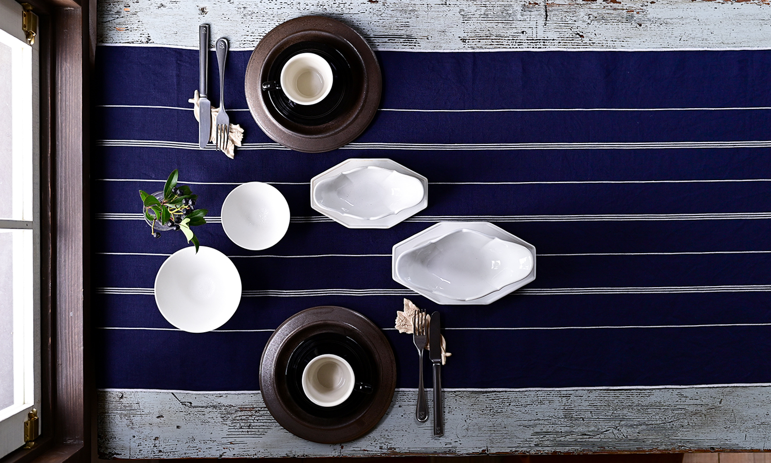 ストライプのクロスにシックな器を合わせた大人のコーディネート。 ストライプ柄はテーブルに奥行きを感じさせ、ゆったりとした印象を与えてくれます。 ネイビーに白のストライプはコントラストがはっきりしており、視線を自然に集めるため、テーブル全体を印象的に彩ります。