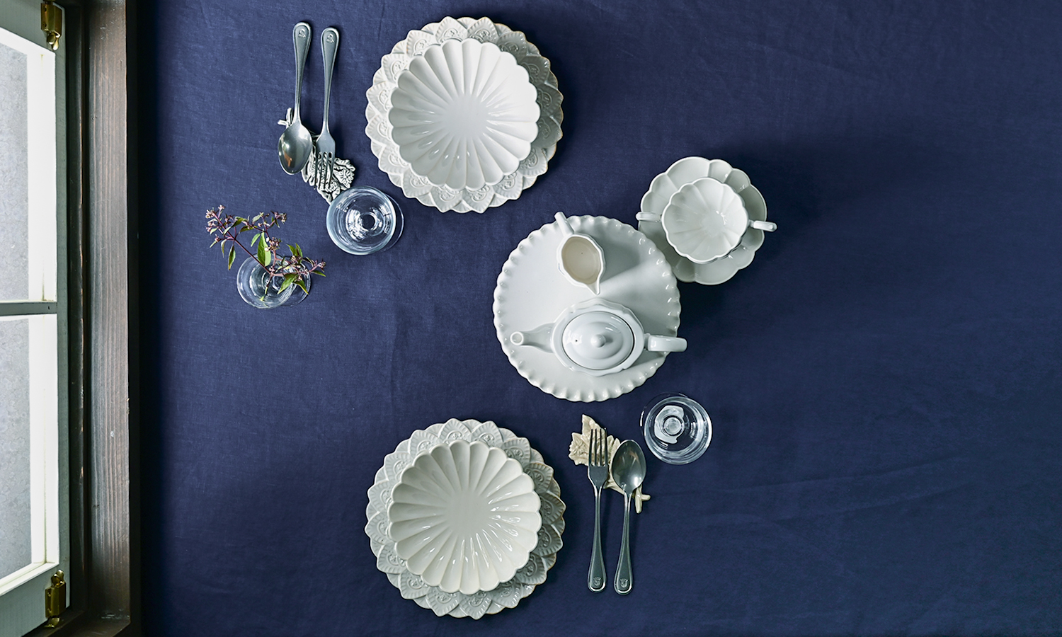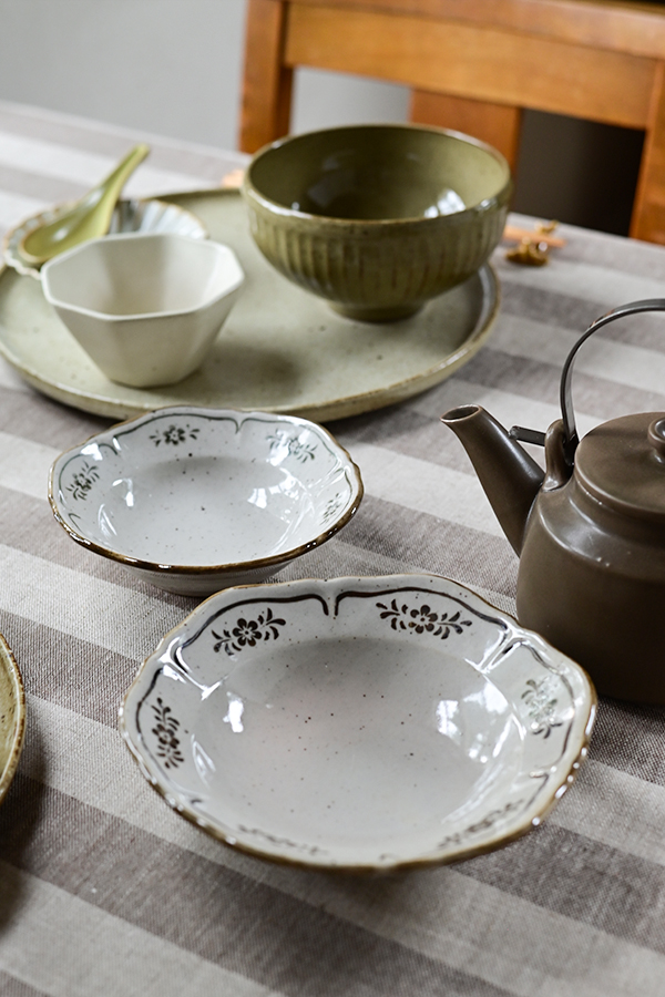 花柄や鎬(しのぎ)模様の器を取り入れることで、素朴ながらも印象的なテーブルに。雑炊や煮物などシンプルな和食を盛り付けても、寂しくならず、テーブル全体で季節感を感じられます。