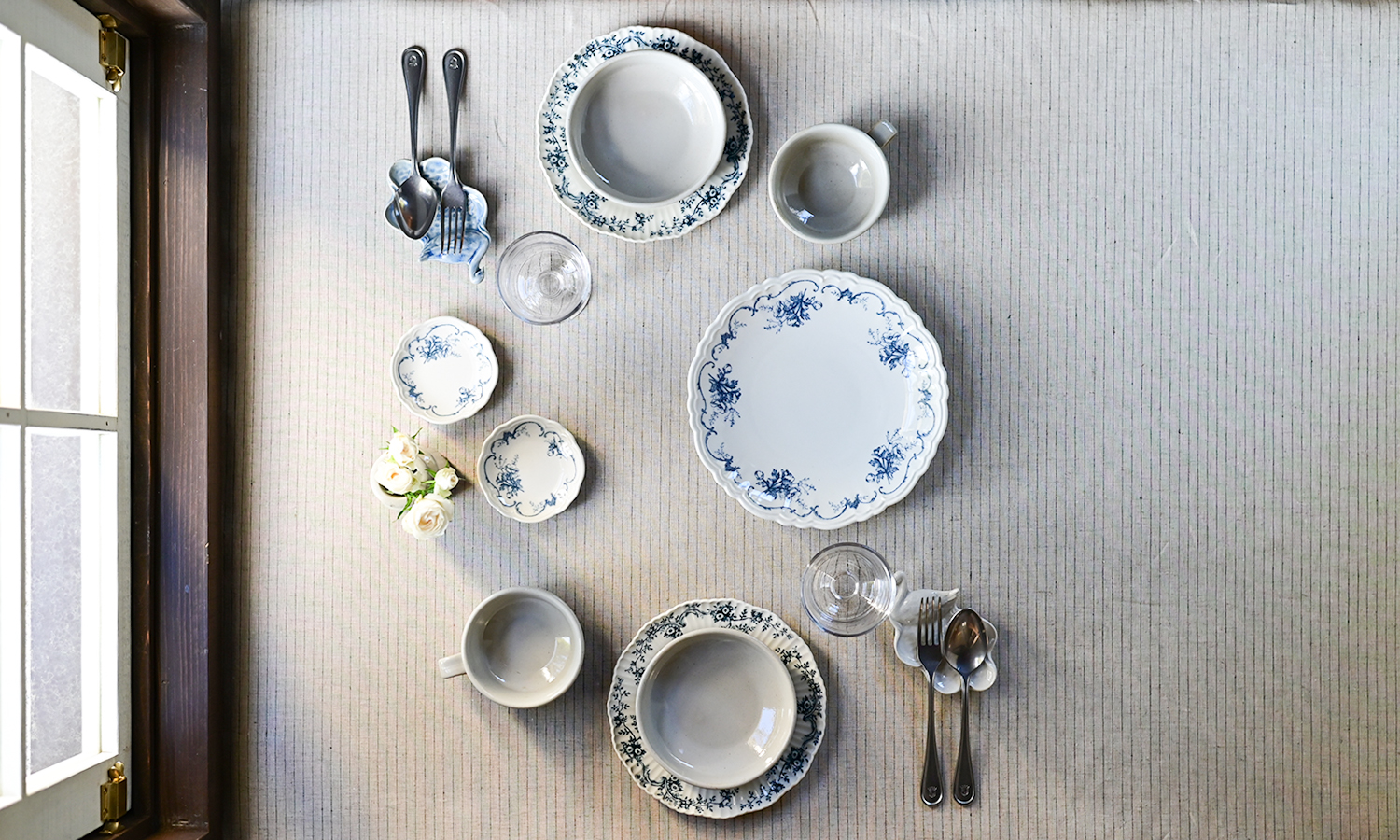 パープルのギンガムチェックのクロスに、深みのあるラズベリーカラーの器を合わせたコーディネート。柔らかな光の中で、温もりと上品さを感じる配色が、冬らしいこっくりとした雰囲気をつくっています。クロスのチェック柄がテーブルにリズムを添え、甘すぎず大人っぽい可愛らしさを演出します。