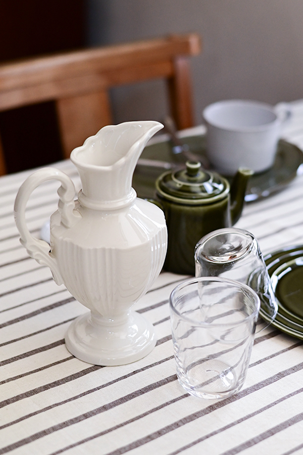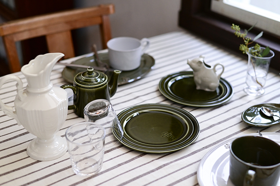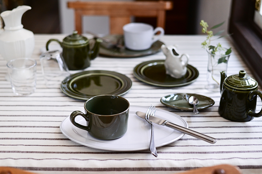 ストライプのクロスに深みのあるグリーンの器を主役にした、穏やかなティータイムのコーディネート。ストライプのクロスは程よいリズムを生み、整いすぎない心地よさを添えています。重ねることで、器の色味が引き立ち、静かな中にも表情のあるテーブルに。