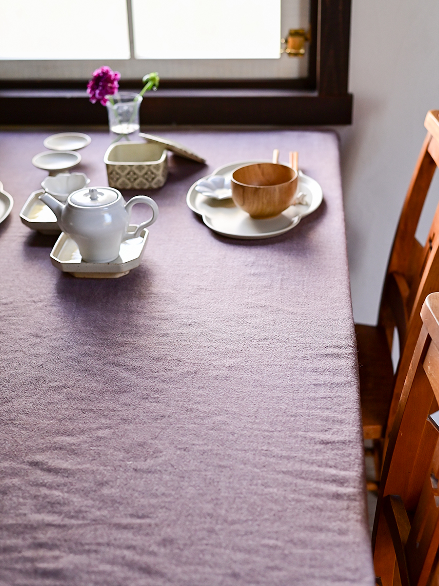 落ち着きのあるパープルのクロスが空間に静けさと奥行きをもたらし、白や生成りの器のやわらかな表情を引き立てるコーディネート。艶を抑えた磁器や素朴な木の器など、異なる素材感を重ねながらも色数を抑えることで、全体はすっきりと調和しています。ベースが穏やかだからこそ、器の形に変化を持たせることで、遊び心やさりげない華やかさを添えています。