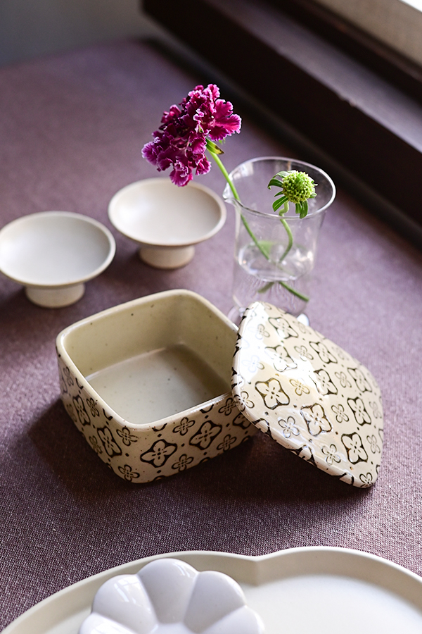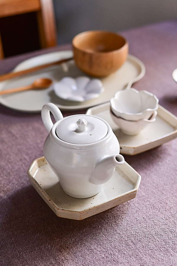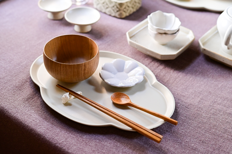 花形のお敷皿を取り入れることで、直線的になりがちなテーブルにやさしいリズムが生まれます。器の下に一枚重ねることで、上にのせた器やカトラリーの輪郭が際立ち、自然と視線が中央へと集まる見え方に。また、器を重ねて使うことで丁寧さが伝わり、肩肘張らない中にもおもてなしの気持ちが感じられます。