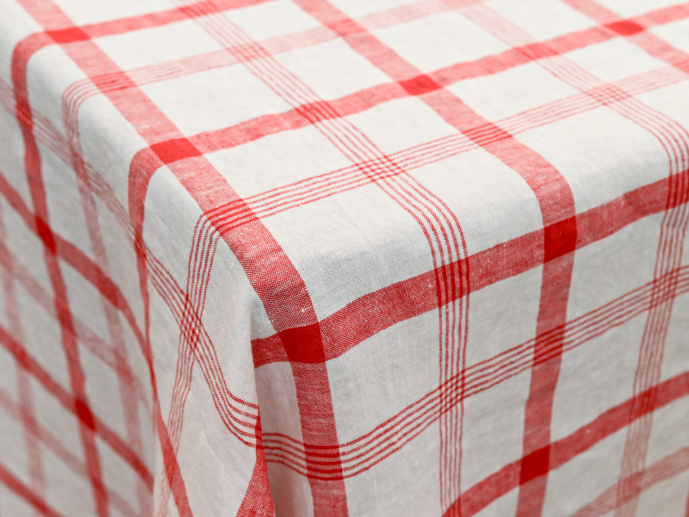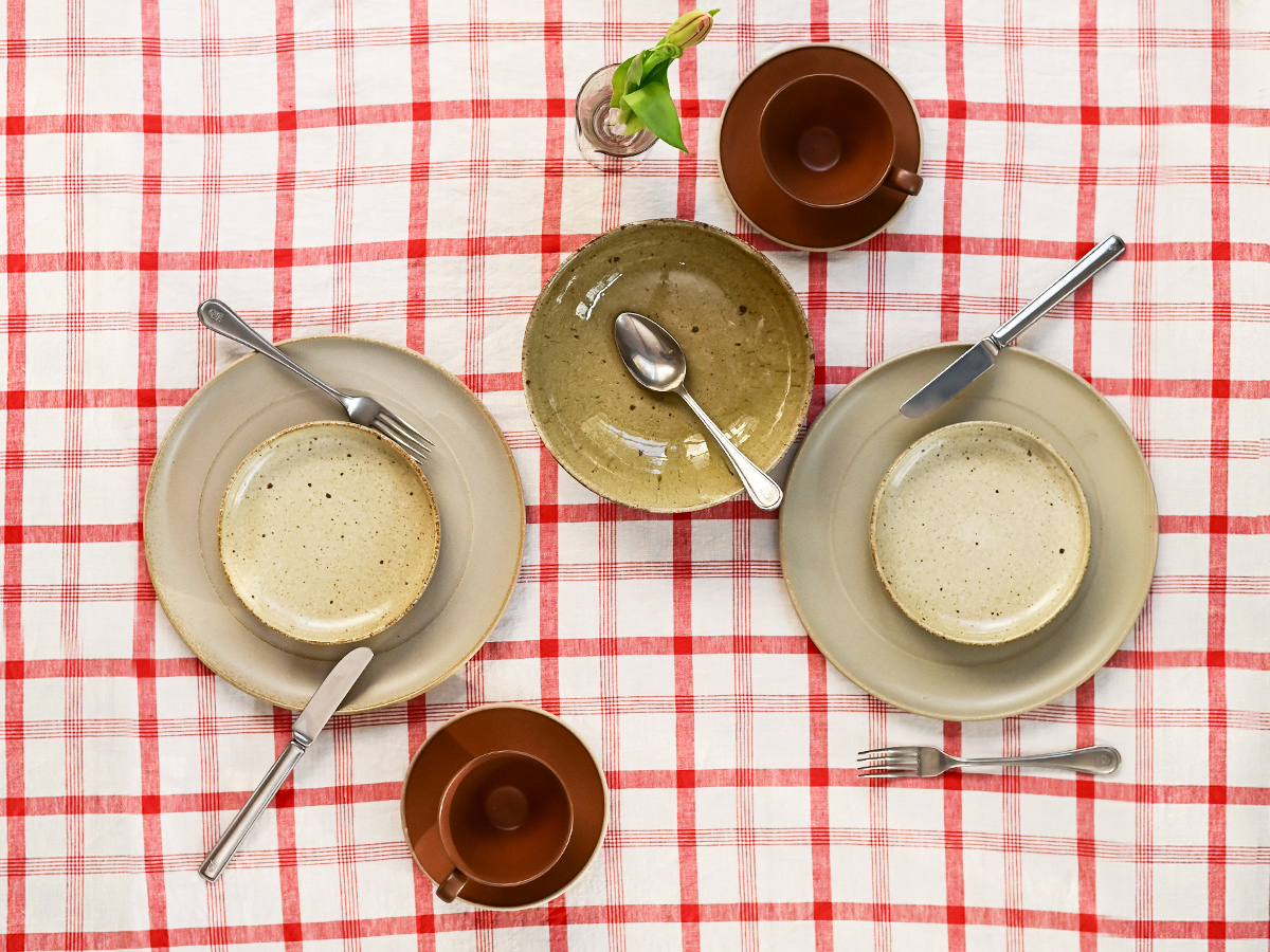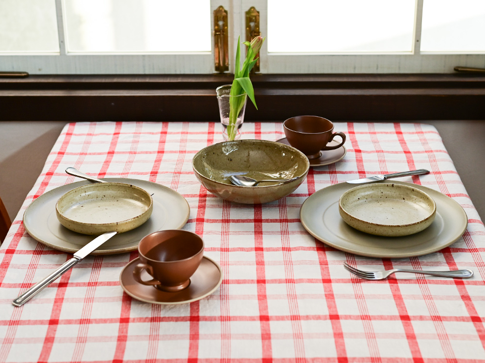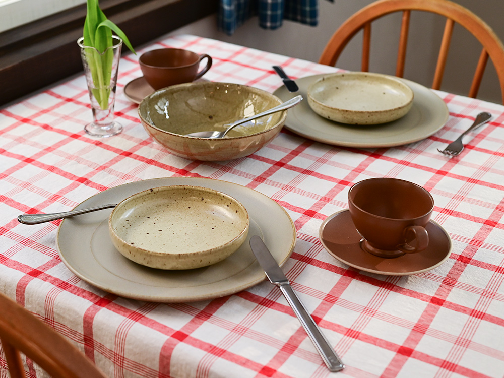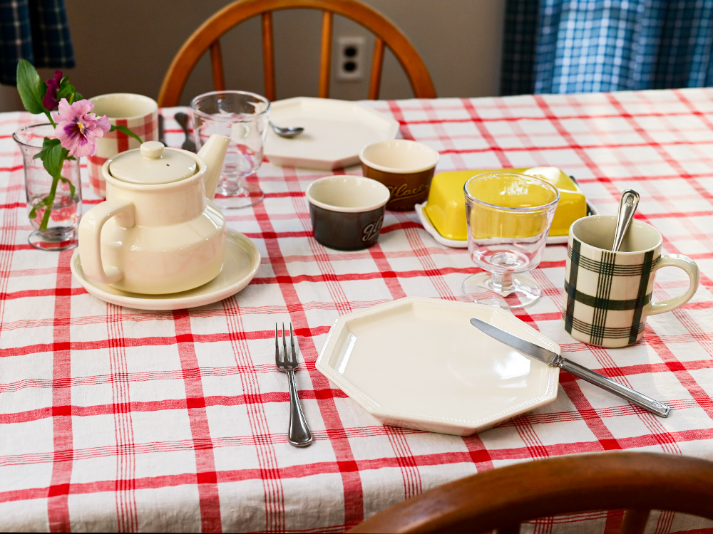 チェック柄のクロスが、田舎のフランスの食卓を思わせる気取らない雰囲気を演出し、