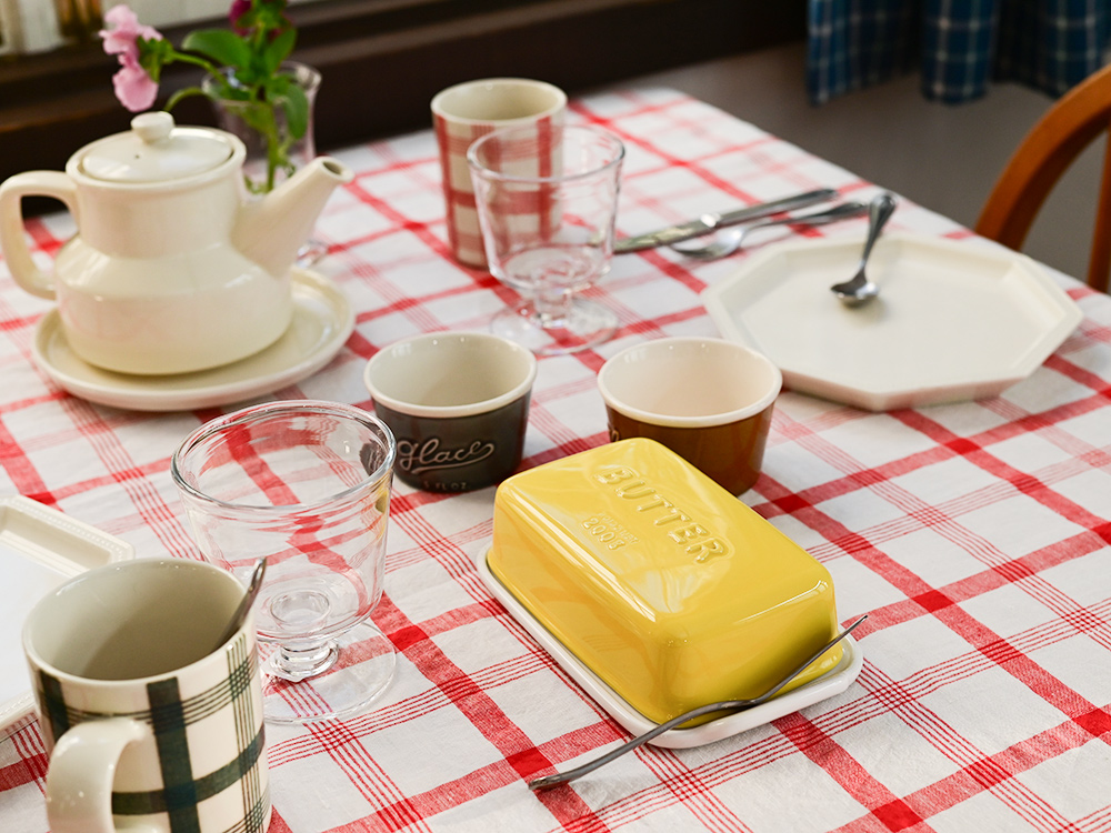チェック柄のクロスやマグ、イエローのバターケースを組み合わせた色合わせは、