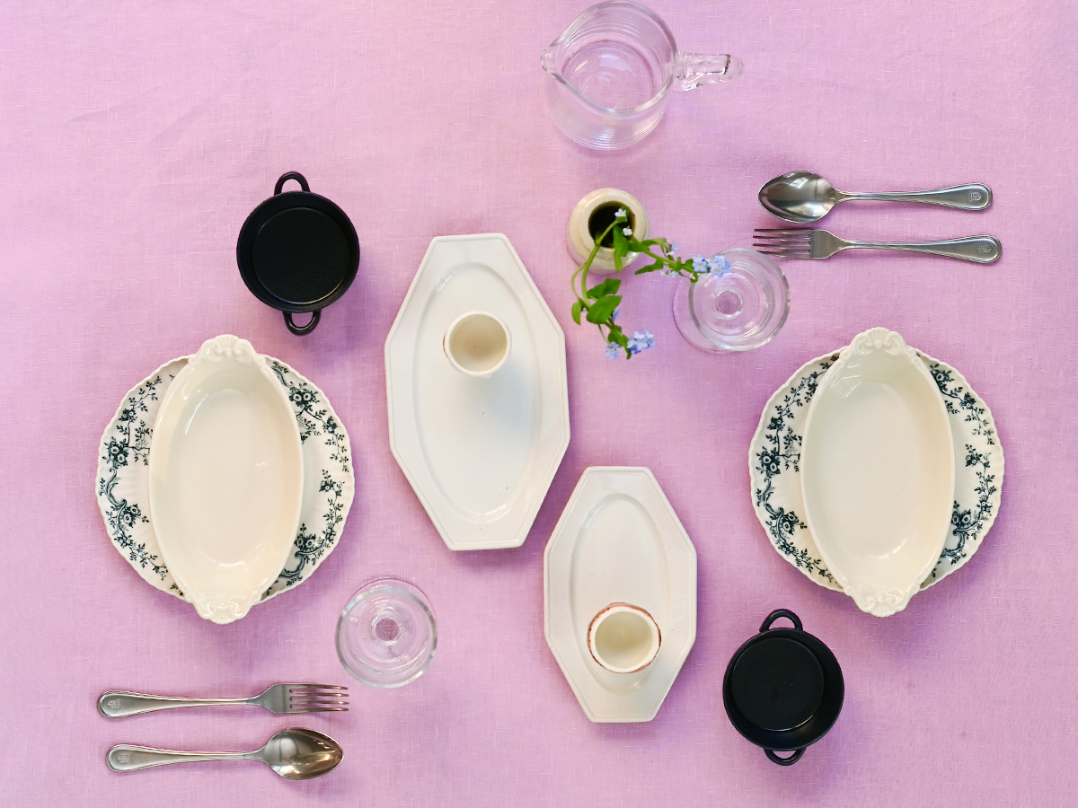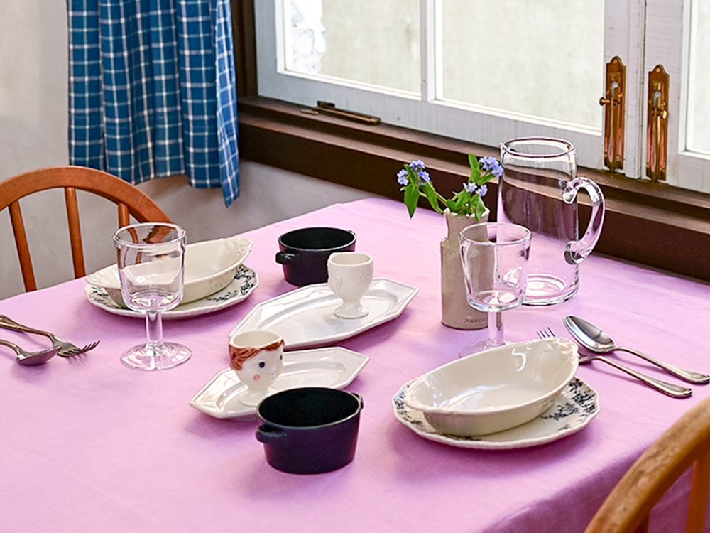 可愛らしい色合いのクロスに合わせた柄や装飾のある器を中心に、それらが引き立つ器をさりげなく取り入れたコーディネート。