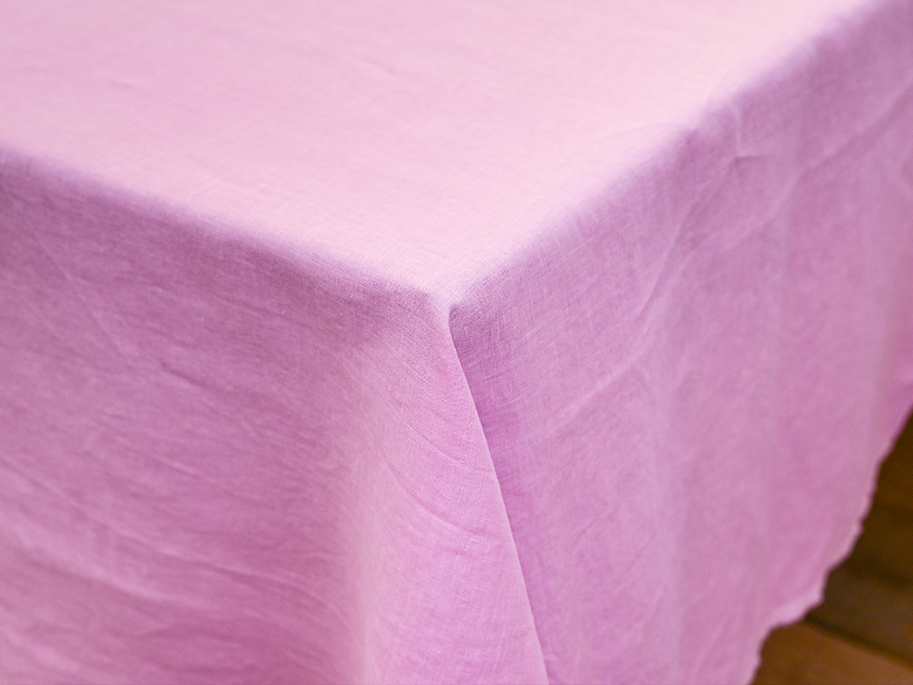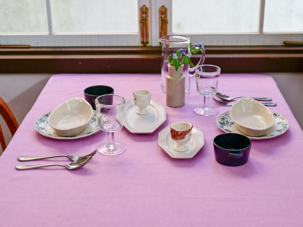 可愛らしい色のクロスに、落ち着いた質感の器を合わせたコーディネート。