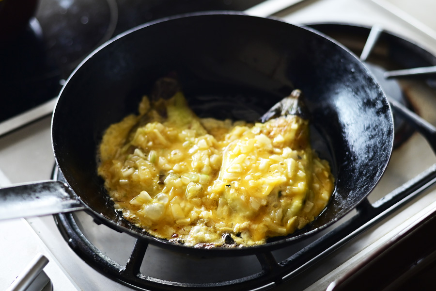 5.残った卵液をなすの上から流し、焼き色がついたらひっくり返して反対側も焼く。