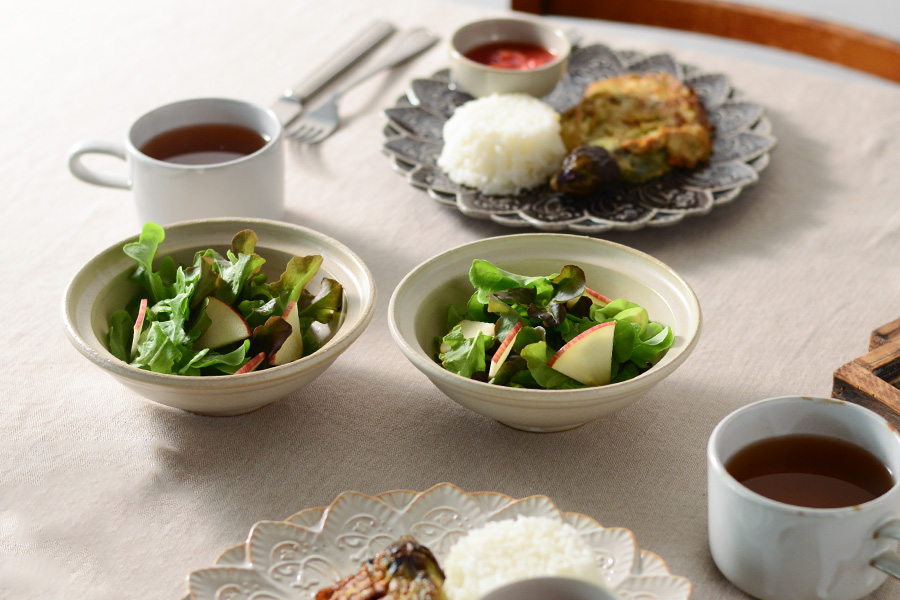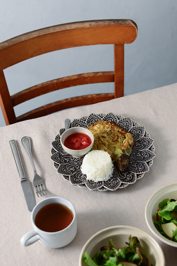フィリピンの卵料理「トルタンタロン」を、レースのような装飾が広がるプレートに盛り付けました。余白からのぞくボタニカルな模様が、素朴な家庭料理に異国のエッセンスを添え、特別な表情を生み出します。生成り色のクロスや陶器のボウルからは、南国の柔らかな光が感じられます。さらに、マグやポットをグレーで統一し落ち着いたトーンにまとめることで、フィリピンの日常の食卓を表現しました。