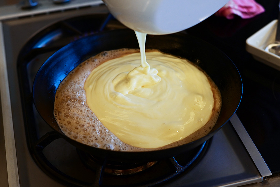 4.弱火にかけたフライパンにバターを溶かし、生地を流す。