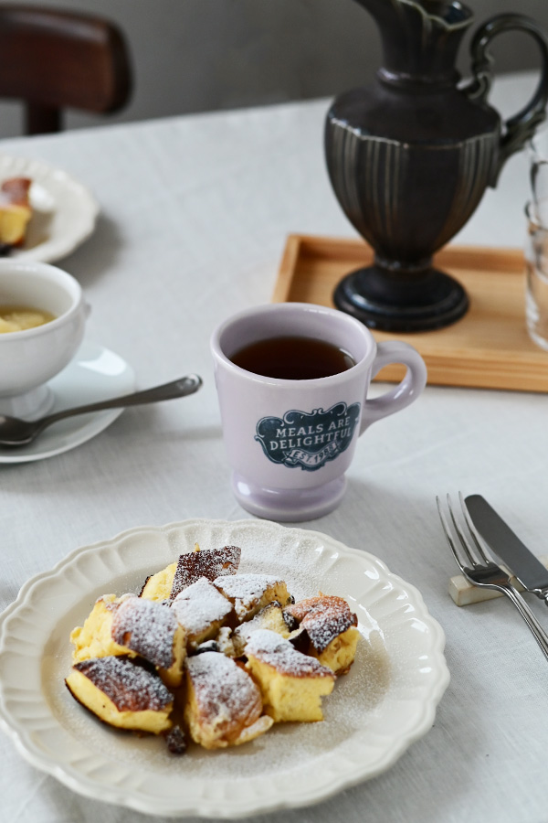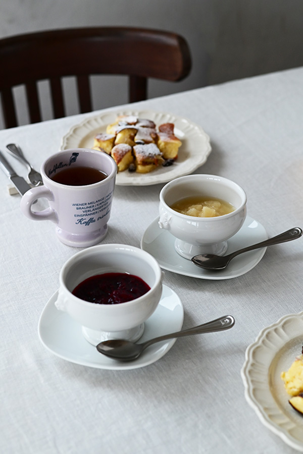 オーストリアの伝統菓子・カイザーシュマーレンを主役に、ウィーンの菓子文化を思わせる端正なテーブルコーディネート。花びらのようなレリーフが施されたポンポネは、粉砂糖をまとった焼き菓子の軽やかさを引き立て、皇帝菓子と呼ばれる由来にふさわしい上品さを添えます。ロゴが印象的なビッテマグは、カフェ文化が根付く街の空気を感じさせる存在。白いテーブルクロスが全体を静かにまとめ、オーストリアらしい気品とやわらかな甘さが調和するコーディネートです。