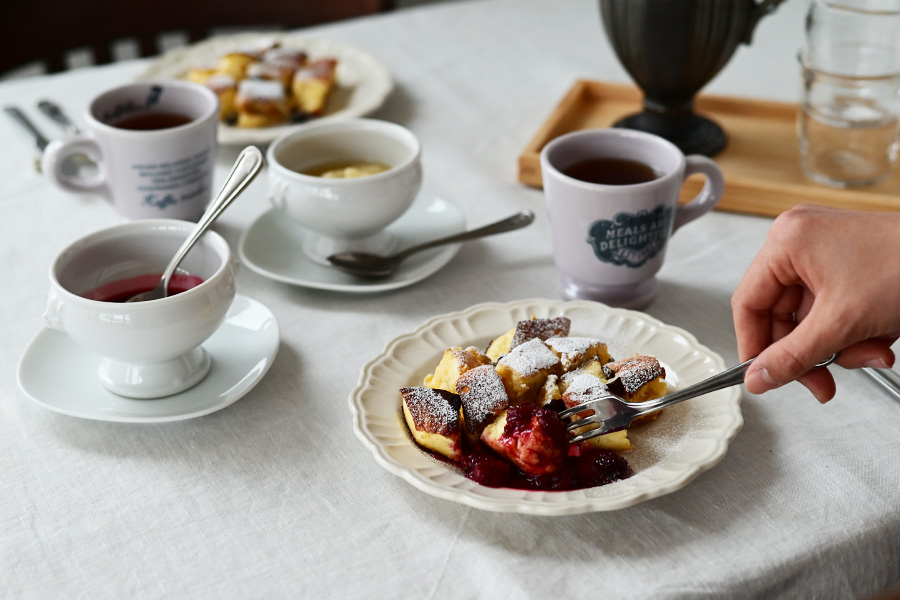 カイザーシュマーレンは、オーストリアで親しまれる、ふわふわのパンケーキをちぎって仕上げる伝統菓子です。皇帝フランツ・ヨーゼフ1世が愛したとも伝えられ、その名には“皇帝のおやつ”という意味があります。生地にはレーズンやラム酒を加えることも多く、香り高い風味が魅力。こんがり焼いた生地を大きくほぐし、粉砂糖をたっぷり振りかけると見た目も華やかです。外は香ばしく、中はしっとりと軽い食感で、ジャムやコンポートを添えるとさらに豊かな味わいに。気取らない温かな甘さが、食卓をほっと満たしてくれます。