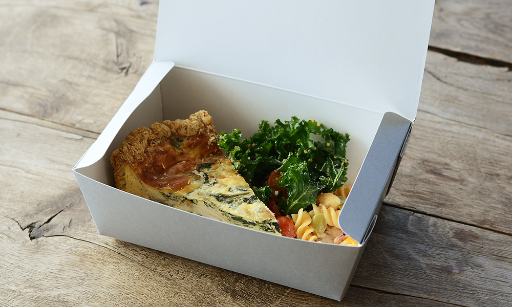 キッシュに、ケールとキヌアのサラダ、マカロニサラダ、ラタトゥイユ。色とりどりのデリを少しずつ選んで、紙箱に詰めてもらいました。