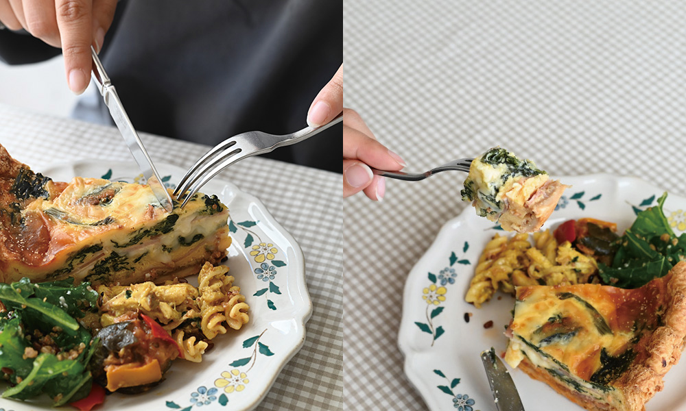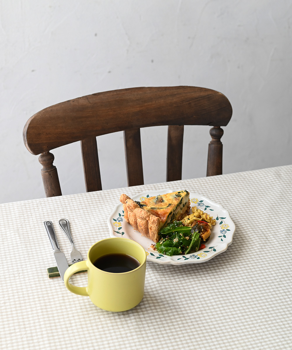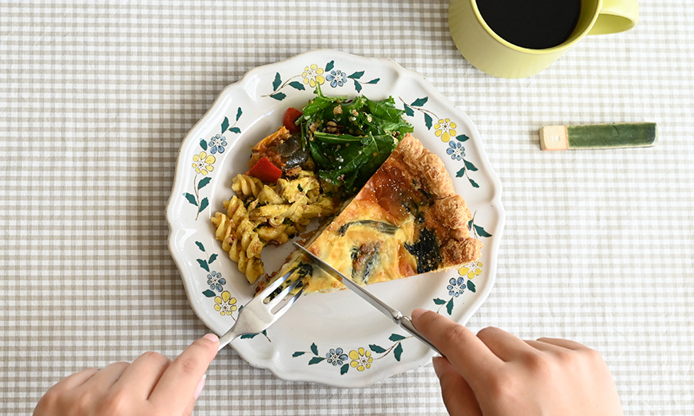 リムの手描き模様が、額縁のようにやわらかく主役を包み込み、“今日はちょっと特別な昼ごはんなんだ”と改めて思わせてくれます。付け合わせのデリは、キッシュの隣へ。ケールとキヌアのサラダやマカロニサラダ。絵柄と料理そのものの色がいっそう引き立ちます。