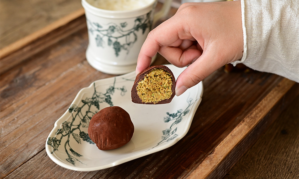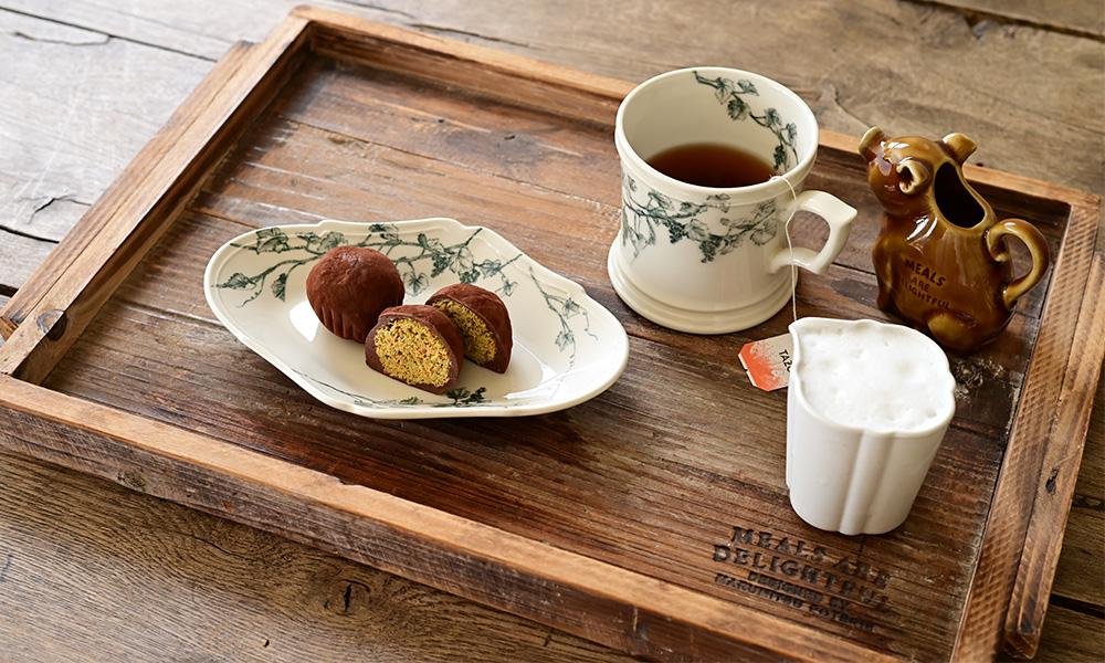 ヴィーニュの菱形プレートの中央に、チョコレートをふたつ。ひとつは丸いまま、もうひとつはカットして断面をこちらに向けます。ブルーの器の上で、チョコレートのブラウンと、内側にのぞくグリーンがくっきりと浮かび上がり、それだけで視線が自然と集まります。装飾のある器ですが、絵柄が主張しすぎず、甘いお菓子を大人っぽく受け止めてくれるところが、ヴィーニュらしさ。