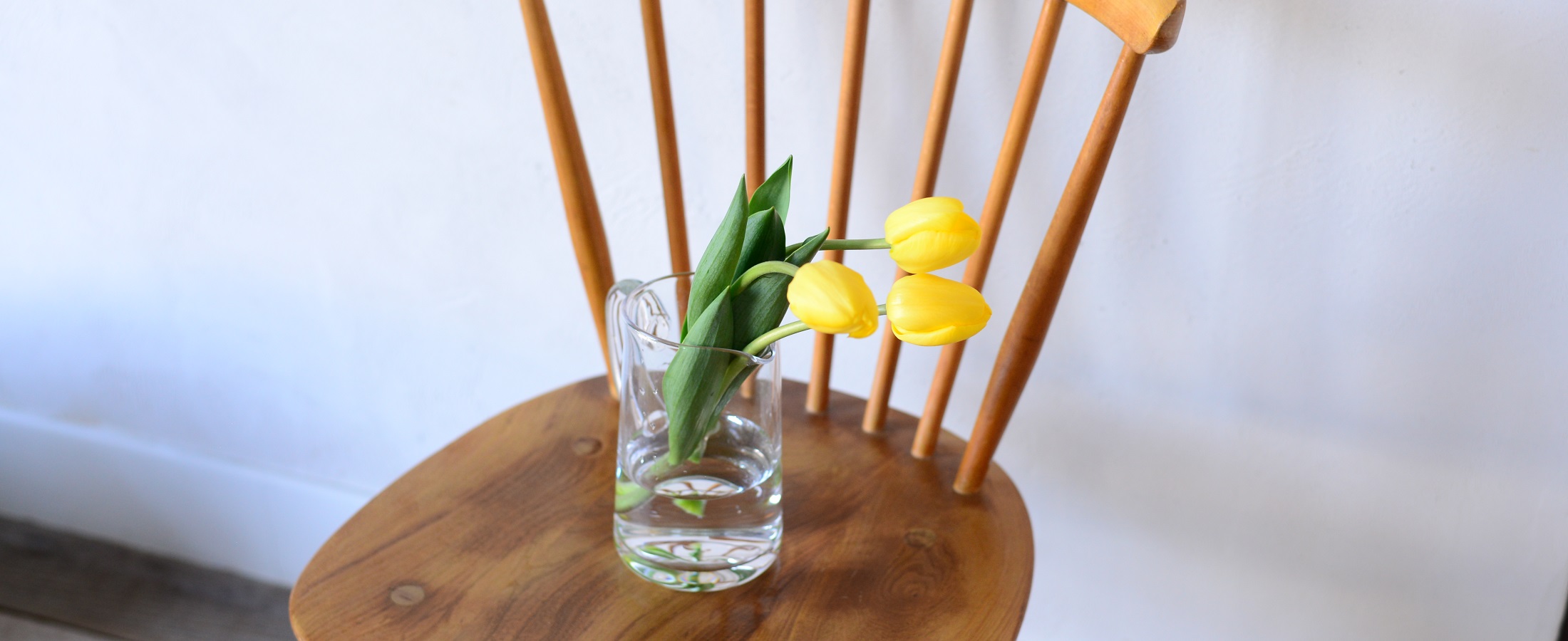 そして存在感のあるピッチャーに活けられた、黄色の一重咲きチューリップ。階段下の椅子の上へ置けば、そこが自然と家のフォーカルポイントに。日常の動線の途中に、ひとつの春の日だまりが生まれました。
