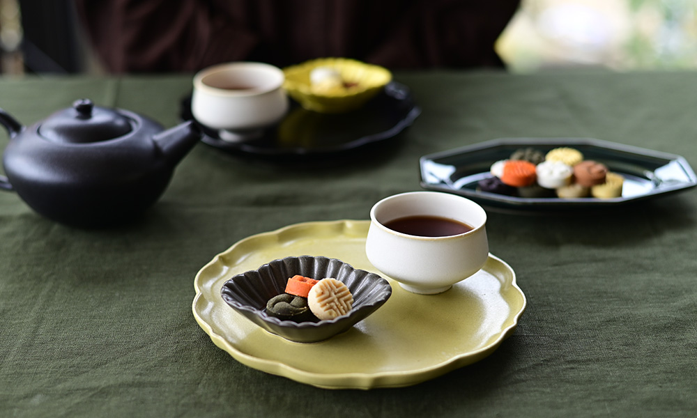 「菊割木瓜」の豆皿と「菓(このみ)」の茶杯の下には、稜花をモチーフにした「風花200プレート」を敷いて。黄色のプレートには黒の豆皿を、黒のプレートには黄色の豆皿を合わせて、お互いの器が色を映し合うようにセッティングしました。カーキのリネンをテーブルに広げると、器の色と模様が穏やかに浮かび上がります。