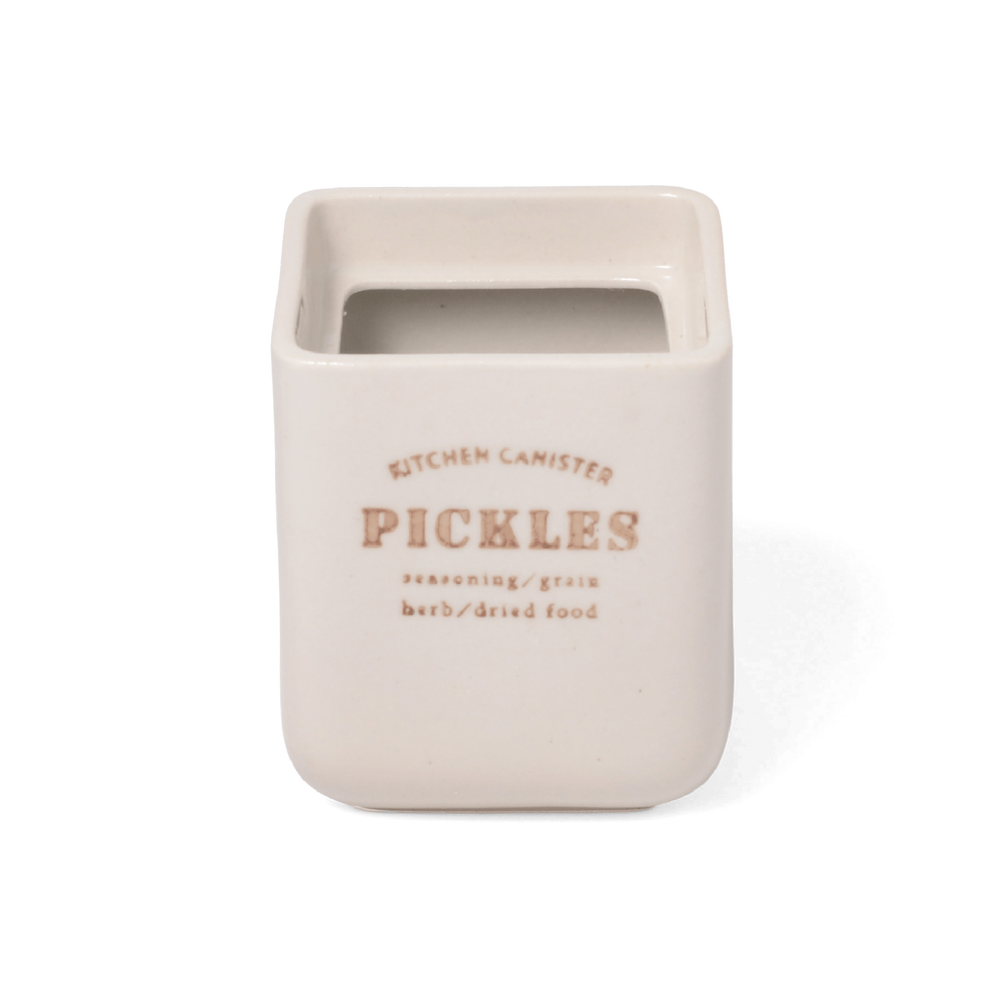 キッチンでよく使う6種類の材料名の判子が入りました。Lサイズはみそ、ピクルスとアザーズ。鉄粉の見える土の表情とかすれた判子が古めかしく、懐かしい印象を作り出しています。炻器は吸水性が少なく、丈夫な素材。収まりの良い四角い形はスタッキングもしやすい形状です。いくつも並べて、見せる収納として使いたいキッチンキャニスターです。
