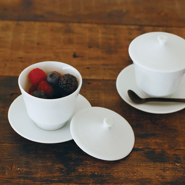 アペルトはイタリア語で「開ける」という意味。シンボリックなフォルムと無数に施された筋が美しいシリーズです。青みがかった白磁が清々しく、小さめの台が全体的に緊張感を与えているので、フォーマルな雰囲気にも適します。