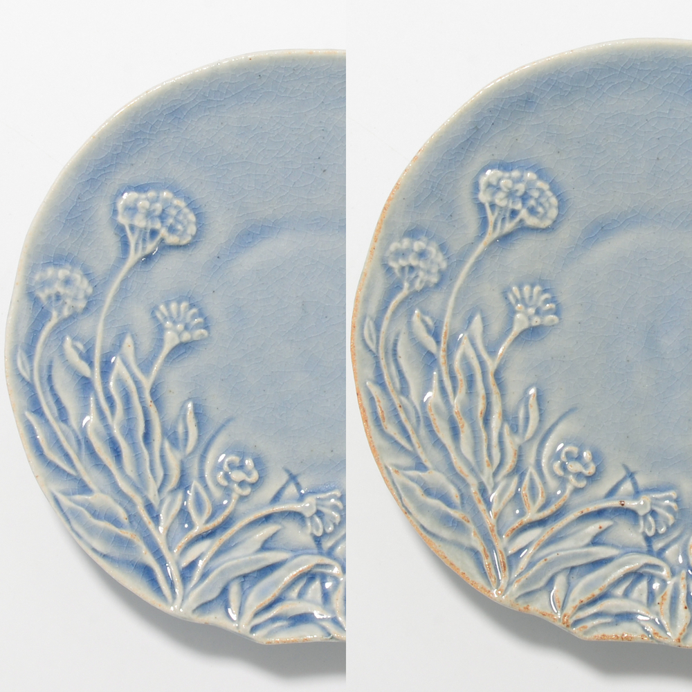 Light pink marks may appear on the surface of tableware items. They appear when a component of the base clay becomes oxidized and then develops a color while fired. Interestingly, each tableware item has the “one of a kind” pattern of light pink marks because they appear depending on a variety of mixed conditions such as components of the base clay, glazes and firing settings, etc. You can enjoy the unique distinctiveness that adds to your own tableware item.