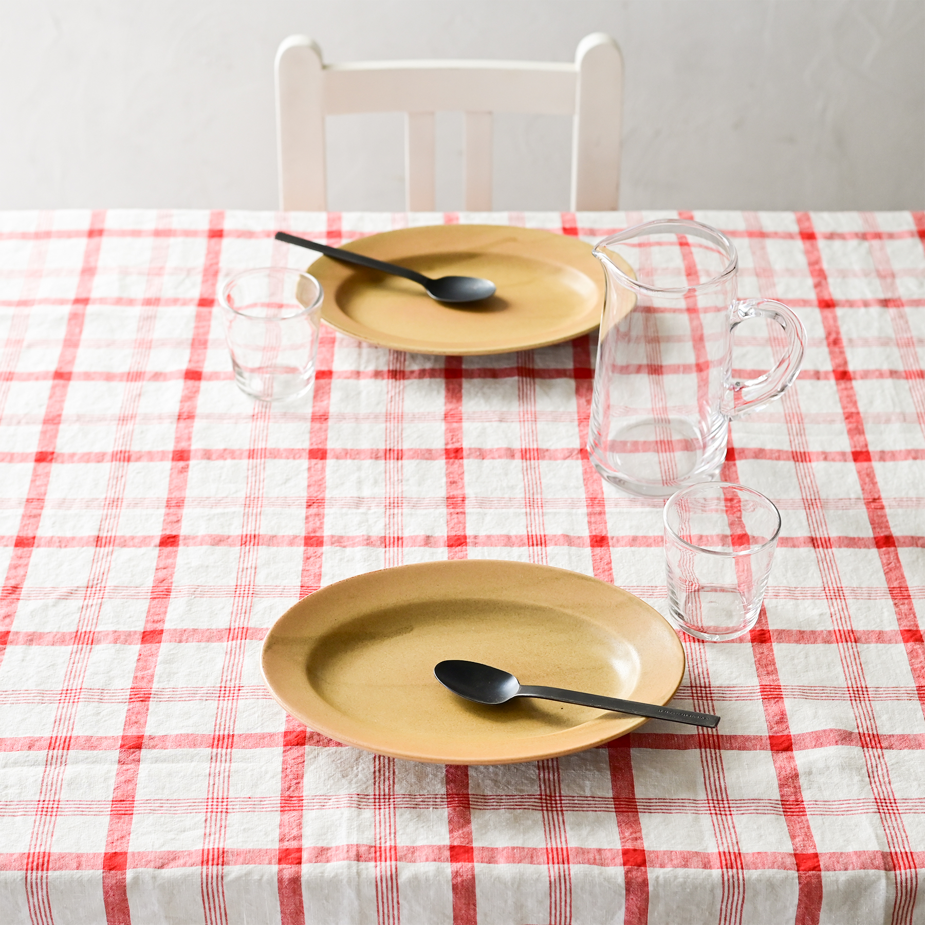 白地をベースにした、清潔感のあるチェック柄。複雑になりすぎない柄にすることで、日常のテーブルに取り入れやすく定番として使い続けられるデザインを目指しました。レッド、ブルー、グリーンの3色は、それぞれ空間での印象が変わります。