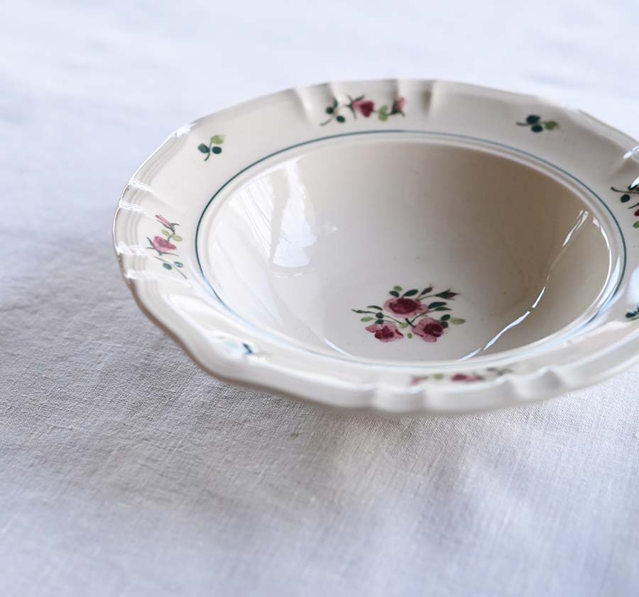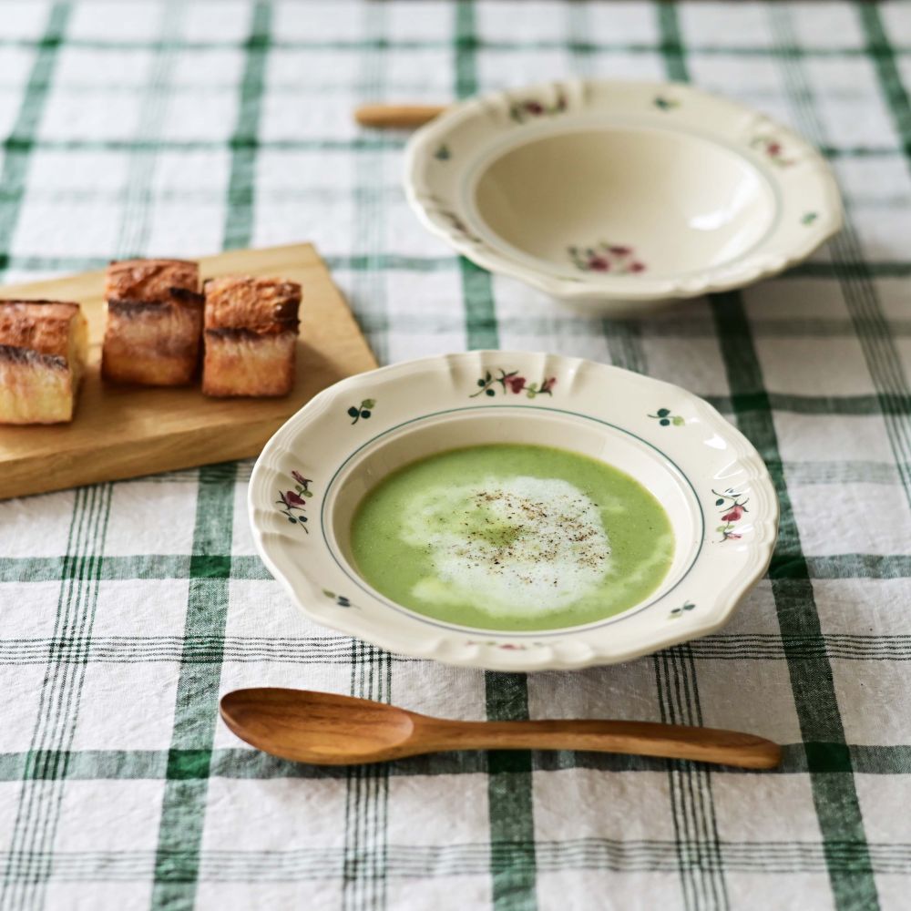 おすすめの使い方はシンプルな料理を盛り付けること。プレートはパンケーキやサンドイッチ、オムレツ、ほうれん草のソテーなどを大胆に盛り付けても、縁回りの装飾が華やかに演出してくれます。ボウルはフルーツとグラノーラ、ポタージュや、グリーンサラダにもおすすめです。