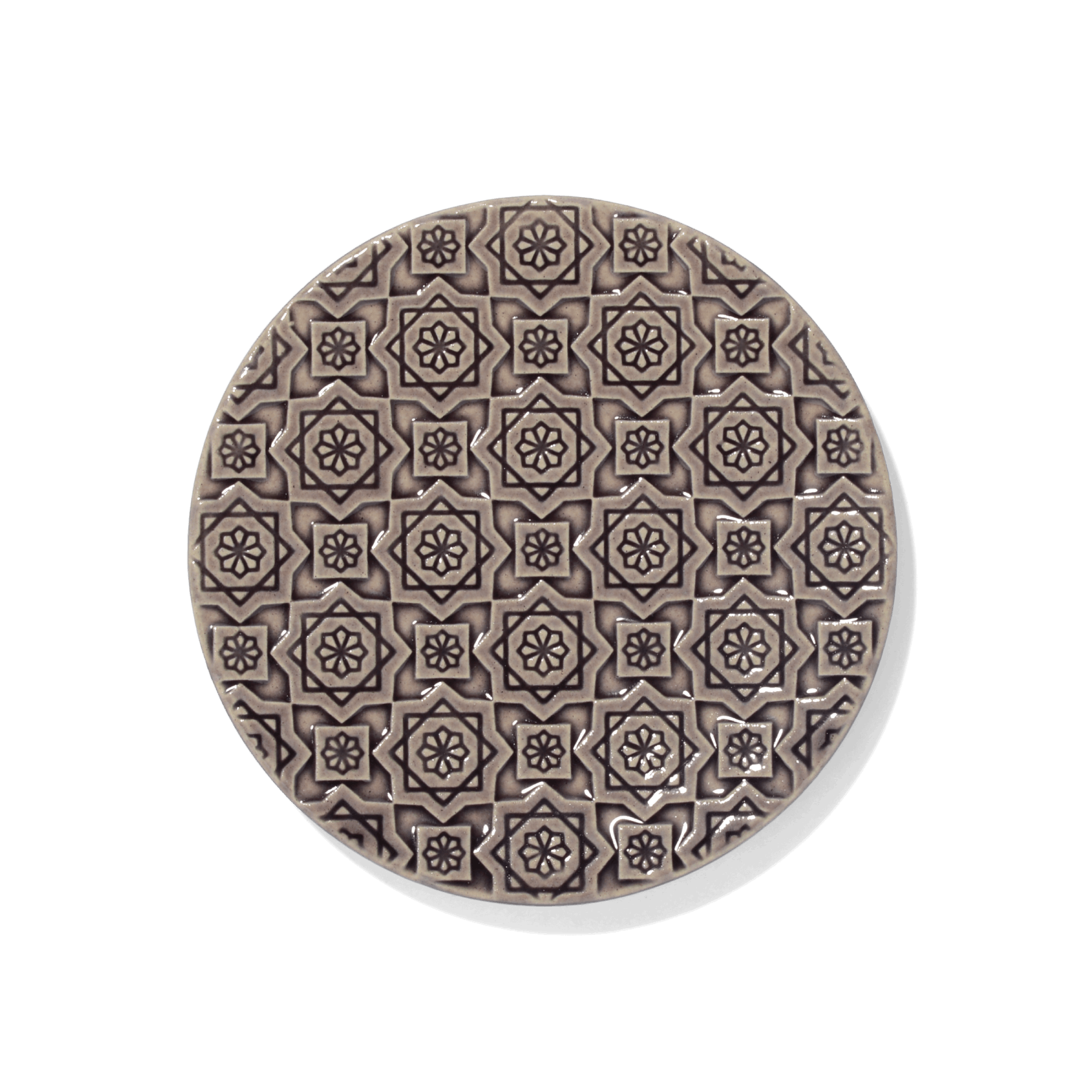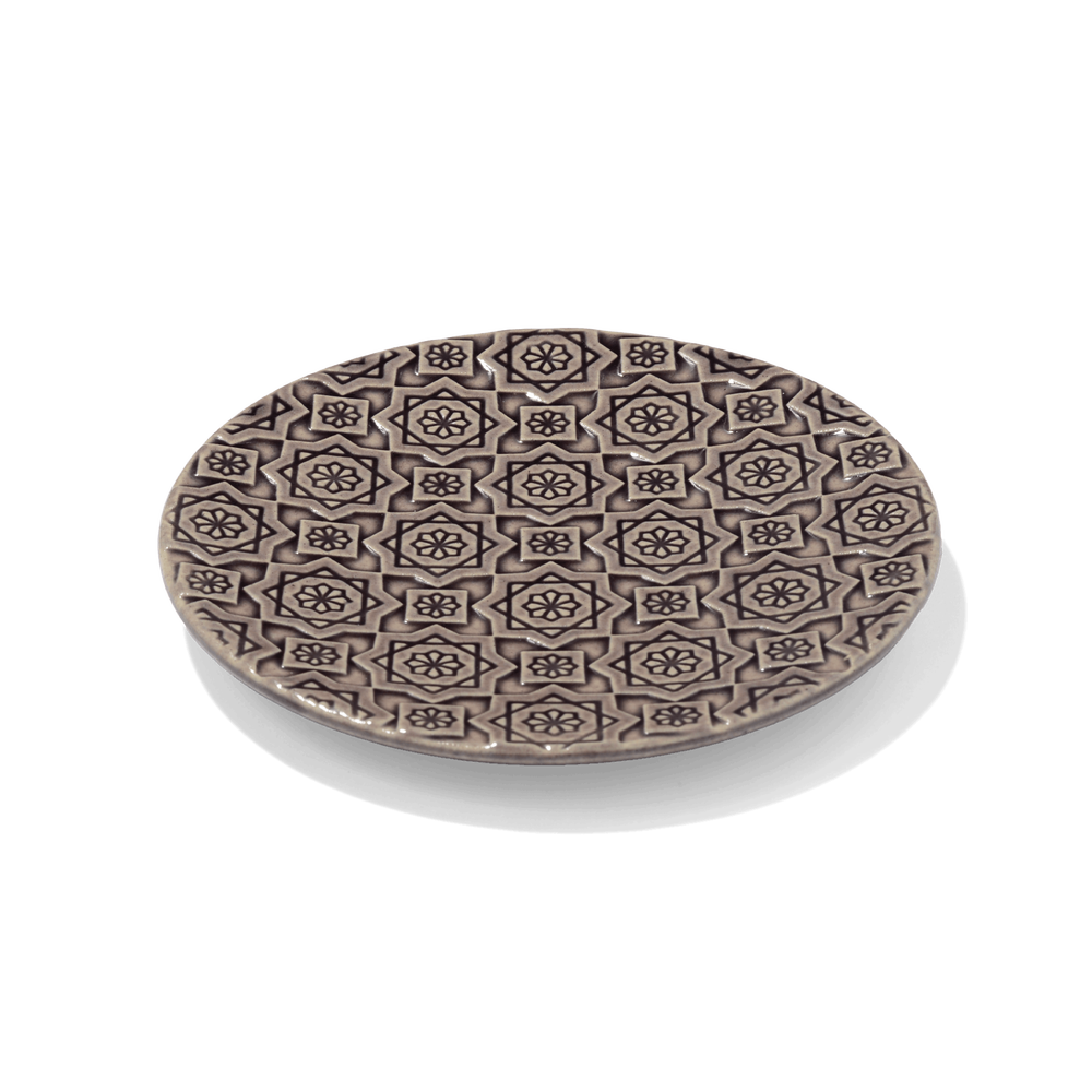 いつまでも飽きずに組み合わせて使えるように、 パターンは大紋と小紋の2種類。万華鏡を覗いた時のわくわく感や、花や星を思わせるデザインに仕上がっています。連続柄が浮かび上がる部分と釉薬がたまる部分の比率が美しくなるように線の太さや深さ、柄の大きさを考えています。