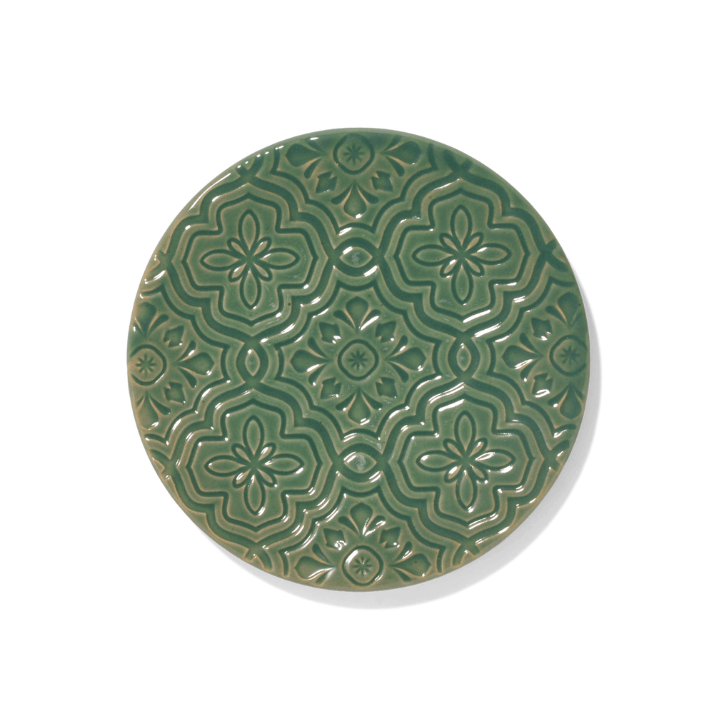 いつまでも飽きずに組み合わせて使えるように、 パターンは大紋と小紋の2種類。万華鏡を覗いた時のわくわく感や、花や星を思わせるデザインに仕上がっています。連続柄が浮かび上がる部分と釉薬がたまる部分の比率が美しくなるように線の太さや深さ、柄の大きさを考えています。