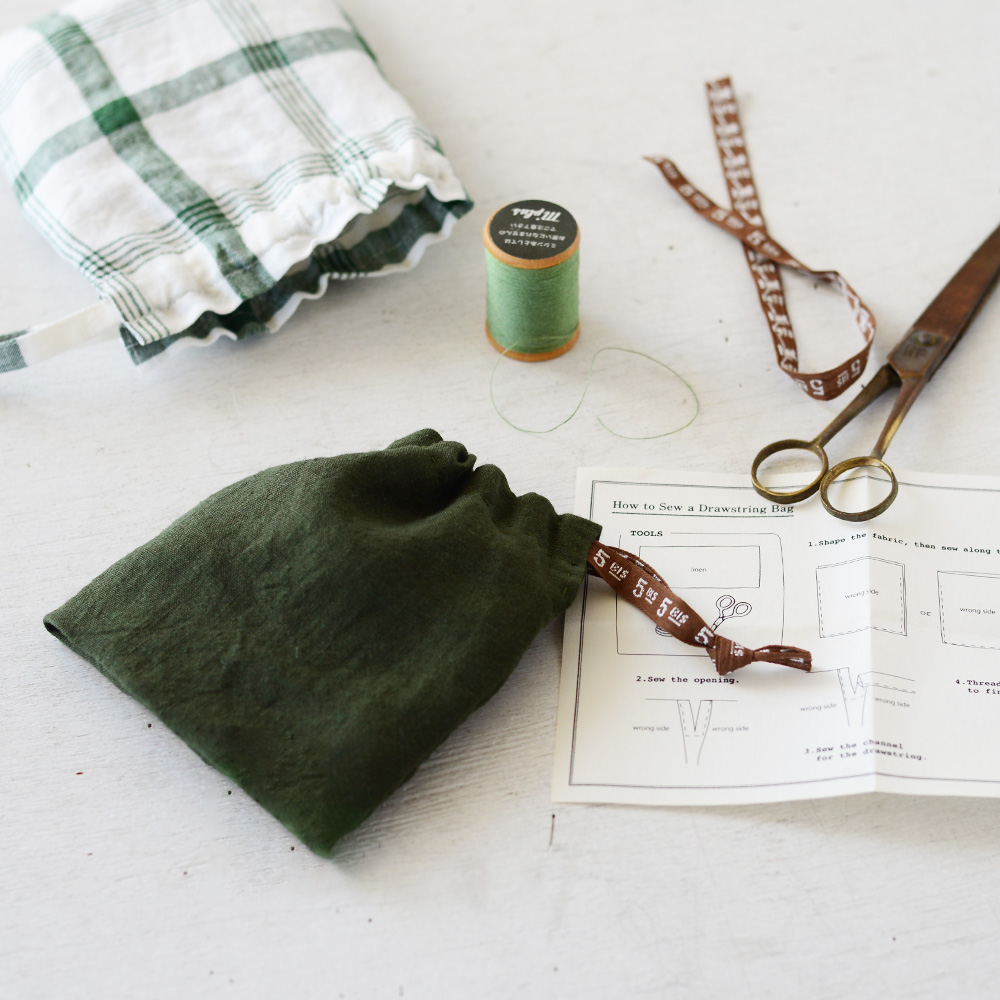 端切れは、マルミツポテリのエプロンや洋服を作ったときにできたもの。上質な国産リネンやウールです。リネン糸と合わせて、あたたかみのある巾着作りをお楽しみください。