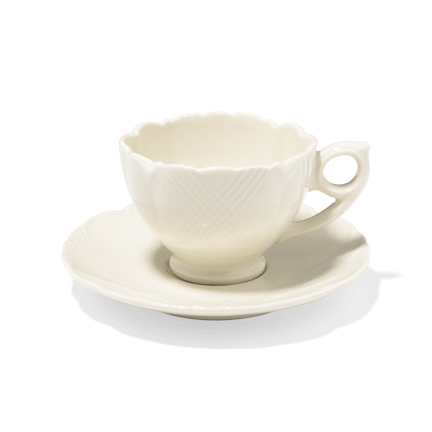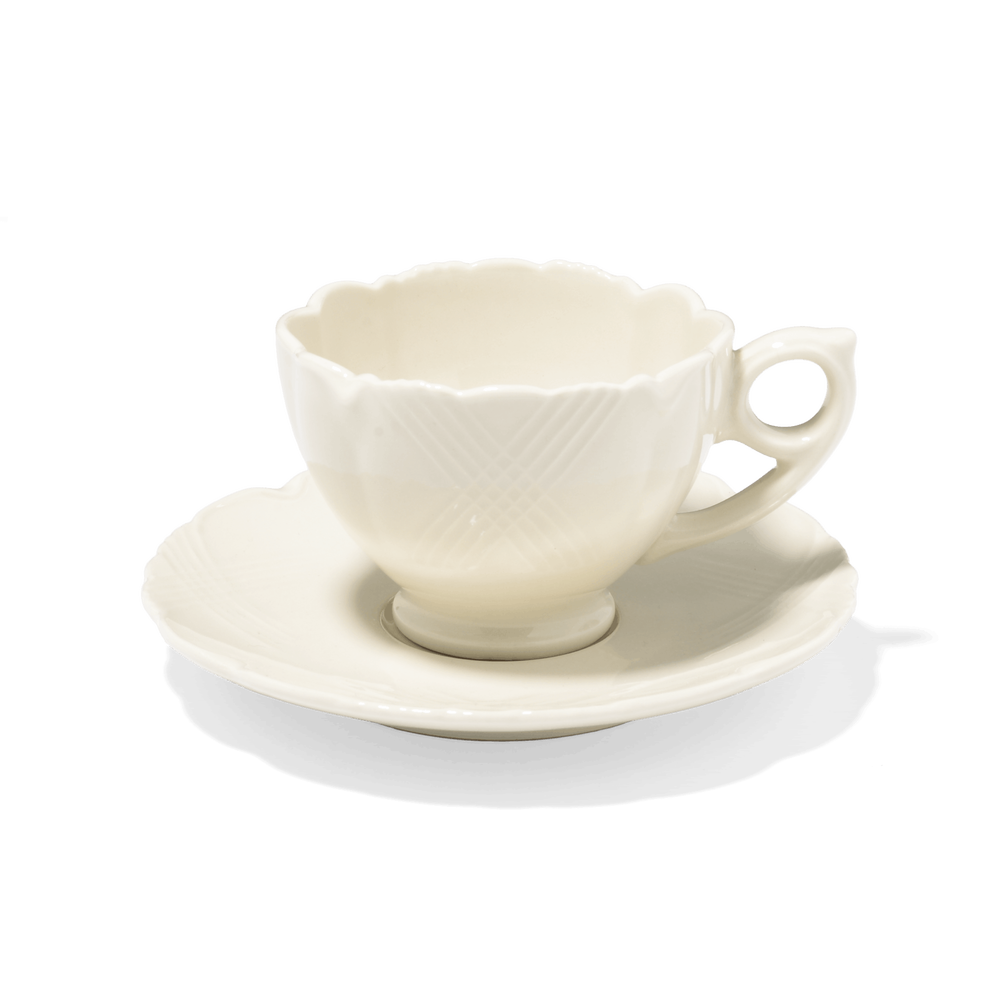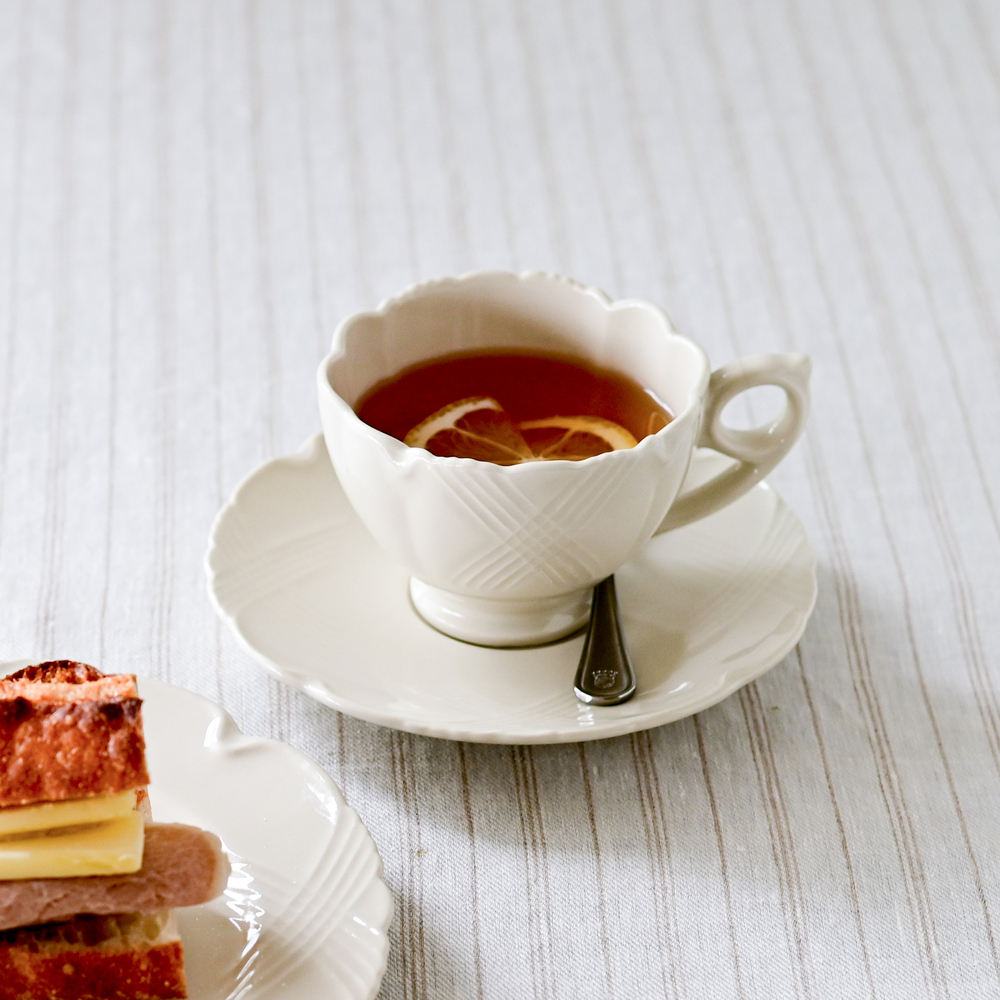 200プレートはパンやサラダ、デザートにも。カップソーサーは、カップはくるりとカーブのついた持ち手がクラシカルな雰囲気。ソーサーはカップを受け止めるレストがついているので安定感があります。